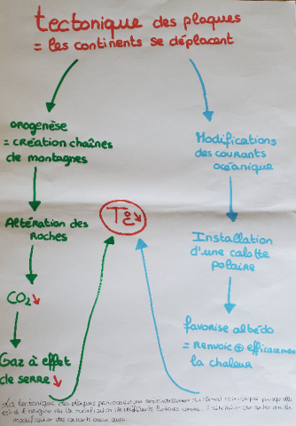 Toujours en groupe, les élèves doivent maintenant construire un schéma-bilan pour montrer comment la tectonique des plaques a influencé le climat du Cénozoïque. Une feuille A3 leur est distribuée, des feutres mis à disposition. Voici un exemple de production :