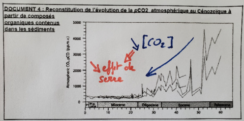 Les élèves forment des groupes de 4 de manière à reconstituer le sujet de départ. Chacun prend la parole et expose aux autres ce qu'il faut retenir de son document. L'élève fait noter la phrase d'interprétation à tous les autres. Exemple pour le document 4 : "On observe une baisse de la concentration de CO2, cela diminue l'effet de serre et diminue la température".